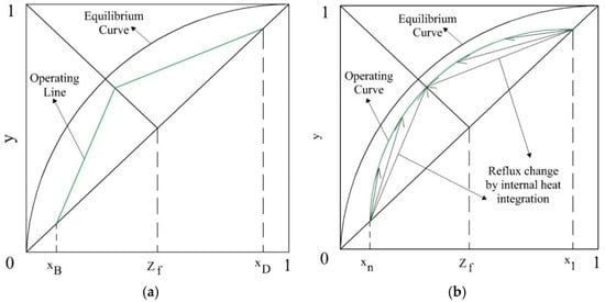 Schematic of the McCabe–Thiele chart for conventional (a) and nonconventional (b) distillation columns.
