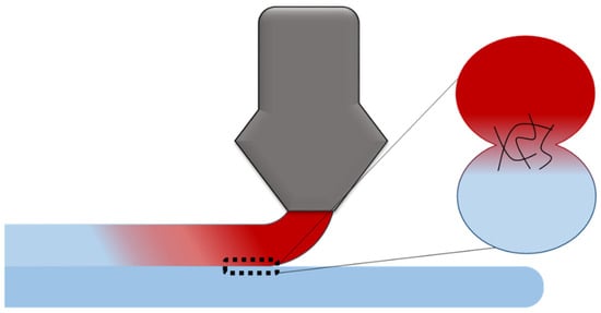 The welding mechanism encompasses all the steps of joining the parts from the beginning to the end of the operation, and involves temperature, surface conditions and pressure during welding []. Polymeric welding involves direct contact of the part’s layers at temperatures above their melting point []. During welding, diffusion of molecules occurs at the contact interface and thus partial or complete diffusion of molecules can occur []. The mobility of the molecules near the surface must be stimulated by a heat source [].