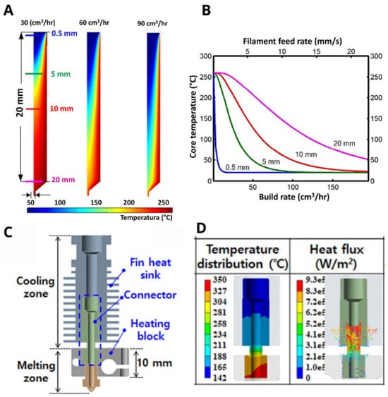 Representation of the heat flux distribution in the printing tube (A) and the core temperature as a function of filament feed rate (B) []. Image of print nozzle and heat sink (C) with the representation in a temperature and heat on the nozzle (D) [].