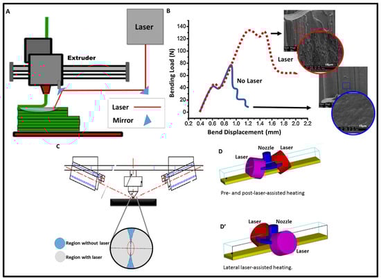Representative scheme of the in situ laser welding system with a mirror on the print head (A) []. Increased mechanical strength with and without in situ laser welding and micrographs of the region with and without welding (B). Representative diagram of the welding system with two lasers (C),Pre andpost-laser-asissisted heating (D) and lateral laser-assisted heating (D’) [].