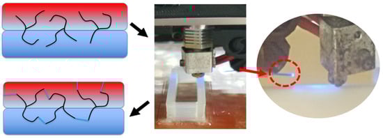 In the study carried out by Levenhagen et al. (2019) [], two changes were made to improve the weld, in which an increase in the maximum transverse stress was obtained compared to the pure nonirradiated sample. Since polymer molecules are large and complex, increasing the cooling speed of the polymeric mass, the amount of solder is reduced during the printing process. In this way, the inclusion of low-weight molecules can be used, resulting in a bimodal mixture. The submission of this mixture to an ultraviolet (UV) irradiation system during the ME process results in a sharp increase in the maximum transverse tensile stress of the printed parts, which can be 140 to 200% []. The control of the intensity of the radiation allows it to act in a balanced way in the formation of the covalent bonds and in the mobility of the polymeric chains to diffuse through the interface [,]. Figure 5 contains a representative diagram of this system, showing the molecules before and after the application of UV light on the left, and the system for application of UV light on the right.