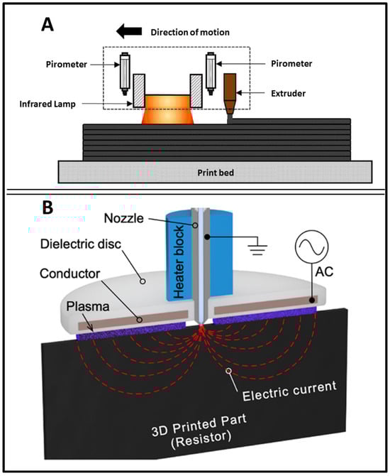 (A) Representative scheme of in situ infrared heating in a large-scale printer []. (B) Representative scheme of the application of electric current in the printing nozzle and plasma formation. Reprinted (adapted) with permission from {Sweeney et al., 2020} []. Copyright {2023} American Chemical Society.