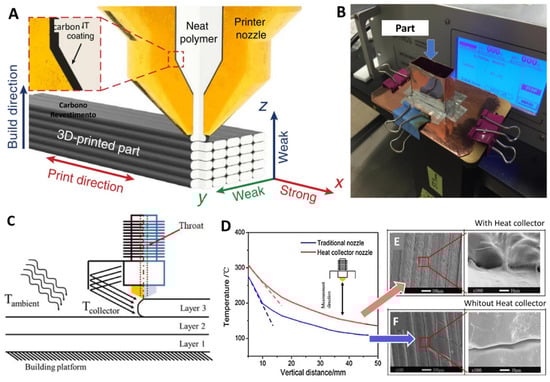 Representative scheme of the carbon coating on the surface of the deposited filament (A) and microwave application in postprocessing (B) []. Representative scheme of the device for collecting heat radiating from the deposited layers (C). Increased heat retention resulting in improved weld (D) and SEM imaging with (E) and without (F) a heat collector [].