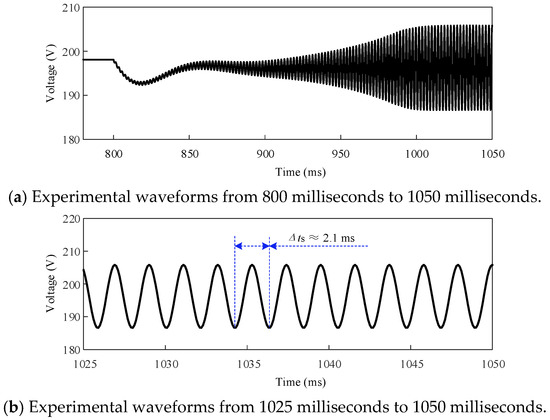 Under the same disturbance condition and the first set of parameters, the waveforms of a DC line with a length of 200 m are shown in Figure 33. As shown in Figure 33, the waveforms of a DC line with a length of 200 m show low-frequency dynamic stability. The actual oscillation frequency of the DC bus voltage waveforms is roughly 74.50 rad/s. The validity of the oscillation frequency of 82.3 rad/s in Figure 19 is verified. The aforementioned waveforms validate the correctness of Figure 17, which indicates that the area of the feasible region for virtual inertia parameters decreases as the length of the DC line is reduced. Additionally, the voltage experimental waveforms of the LVDS and its ROM are largely congruent.