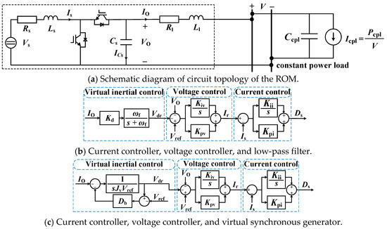 where Vdr, Io, and Vref are the virtual voltage reference, output current, and rated voltage of the ROM, respectively. The system-level closed-loop voltage transfer function Gviv_sys(s) is defined when Vref and V are taken as the input and output signals. By simultaneously solving Equations (4), (6) and (12)–(14), the mathematical expression of the transfer function Gviv_sys(s) can be written as presented below: