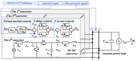 With the increase in installed capacity of photovoltaic power generation and wind power generation [1,2,3], low-voltage distribution systems (LVDSs) have attracted widespread attention from a wide range of scientific and technological workers, power equipment manufacturing companies, and power supply and distribution companies [4,5,6]. Generally, LVDSs are composed of devices such as energy storage converters, DC lines, photovoltaic power-generation units, and constant power loads [7,8,9,10]. The stability of the DC bus voltage of an LVDS is usually maintained by multiple energy storage converters [11,12,13]; however, due to the interaction between the negative resistance of constant power loads [14,15,16], DC lines, and the output impedance of energy storage converters, high-frequency (HF) oscillation instability of the DC bus voltage is prone to occur [17,18,19,20].