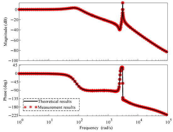 The validity of the reduced-order model established in this paper is verified through frequency measurement [39,40], with details provided in Figure 4. During the frequency measurement, the power of the CPL is set to 0.8 kW. This is because the experimental results in Figure 2 are stable when the power of the CPL is set to 0.8 kW. The theoretical results and measurement results of transfer function Gviv_eq_line(s) are shown as the black solid line and the red dashed line with asterisks in Figure 5, respectively. As indicated by the amplitude-frequency response waveform and the phase-frequency response waveform presented in Figure 5, the measurement results almost align with the theoretical results. From this, it can be inferred that the stability of the LVDS can be analyzed through the transfer function Gviv_eq_line(s). In other words, the stability of the LVDS is the same as that of the reduced-order model.