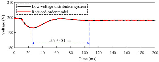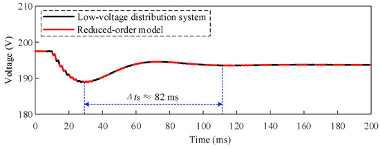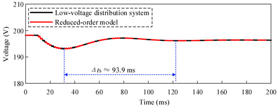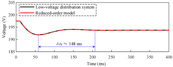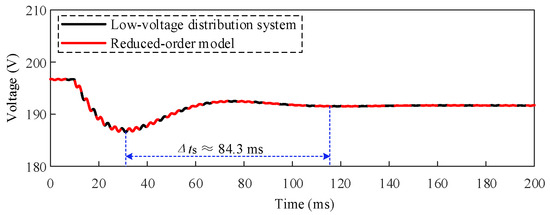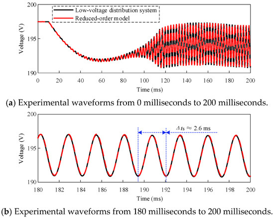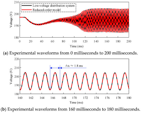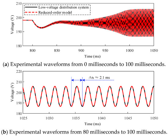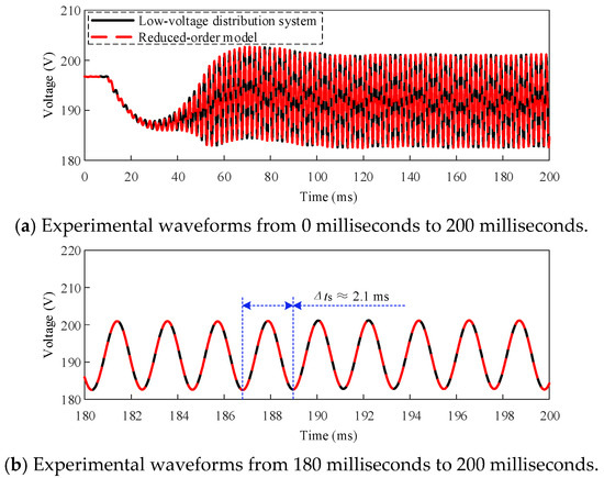 To verify the effectiveness of the virtual-inertia-equivalent modeling method, the ROM is built on PLECS software. When the power of the CPL is stepped from 0.8 kW to 1.5 kW, the simulation waveforms are presented in Figure 6. As indicated by the figure, the simulation waveforms of the LVDS and its ROM are basically consistent. This verifies the effectiveness of the virtual-inertial-equivalent modeling method proposed in this paper. The fundamental reason for the effectiveness of this method lies in the mathematical analytical equations provided by (2), (10), (17) and (18). Based on these equations, the filtering circuit, DC line, current control loop, voltage control loop, and virtual-inertia control loop of the LVDS are all equivalently processed. In this equivalent process, no parameters are neglected. This is why the experimental results of the LVDS and its ROM are almost identical.