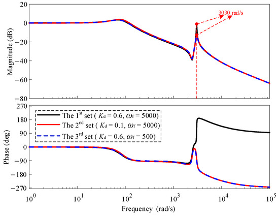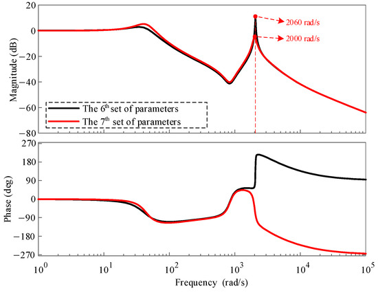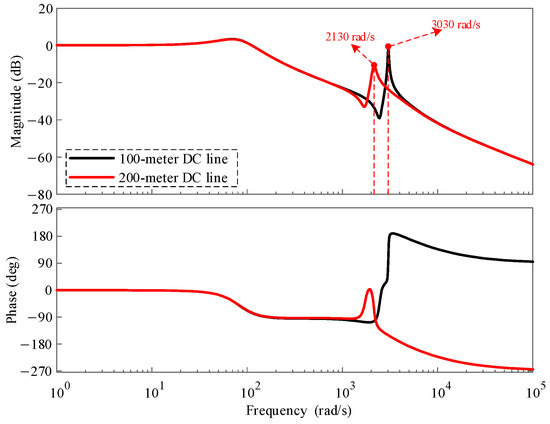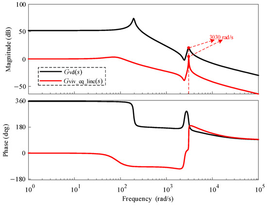 The frequency response curves of Gvd(s) and Gviv_eq_line(s) are shown as the black solid line and the red solid line in Figure 7, respectively. Based on Figure 7, a theoretical explanation for the unstable HF oscillation phenomenon in Figure 6 will be given. The transfer function Gvd(s) has an HF oscillation peak at an oscillation frequency of 3030 rad/s. Combining Figure 3, it can be seen that the LC oscillation link of this HF oscillation peak is composed of Ccpl and Rl/Ll. In Figure 7, the transfer function Gviv_eq_line(s) also has an HF oscillation peak at an oscillation frequency of 3030 rad/s. Based on this, it can be inferred that under the existing virtual inertial parameters, the virtual inertial control strategy fails to effectively suppress this HF oscillation peak.