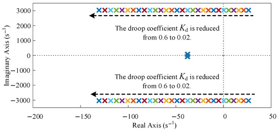 To address the instability issue in LVDSs, the impact of droop coefficients on system stability is studied. The power of the CPL is set at 1.5 kW, and the movement trajectory of the high-frequency conjugate poles when the droop coefficient changes is illustrated in Figure 10. The high-frequency conjugate poles are observed to move from the right side of the imaginary axis to the left side as the droop coefficient varies from 0.6 to 0.02. It can be inferred that the stability of the LVDS can be improved by altering the droop coefficients.