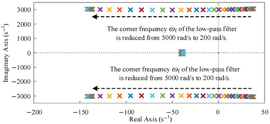 Along with the same analytical approach, the impact of the corner frequency of the low-pass filter on system stability is also being studied. The power of the CPL is set at 1.5 kW, and Figure 11 illustrates the movement trajectory. It is observed that when the corner frequency changes from 5000 rad/s to 200 rad/s, the damping factor shifts from negative to positive. That is, the high-frequency conjugate poles move from the right side of the imaginary axis to the left side. It can be inferred that the instability issue in the LVDS, caused by the negative impedance of the constant power load, can be addressed by modifying the corner frequency of the low-pass filter.