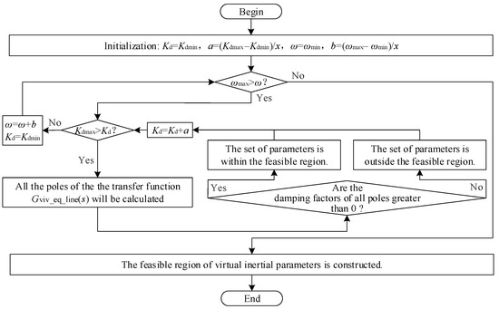 To intuitively assess the impact of the interaction between the droop coefficient and the corner frequency on the stability of the LVDS, the concept of a feasible region for virtual inertia parameters is proposed in this paper. This feasible region uses the droop coefficient and the corner frequency as its parameter space. Then, based on the zeros and poles of the transfer function, a feasible region-solving method is proposed. The detailed process is illustrated in Figure 12.