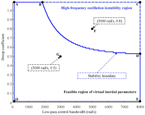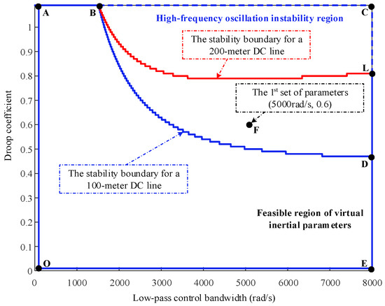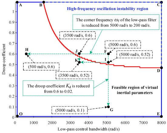 The virtual inertia parameter feasible region of this LVDS is depicted using the proposed solving method, as shown in Figure 13. In Figure 13, the closed-loop region formed by Point A, Point B, Point D, Point E, and Point O is represented as the feasible range for virtual inertia parameters, which is denoted as feasible region FRABDEO. If the droop coefficients and the corner frequency of the low-pass filter within the feasible region FRABDEO are adopted, stability can be ensured. For instance, Point G is located within the feasible region FRABDEO, indicating that the small-signal stability of the system can be ensured when the droop coefficient is set to 0.1 and the corner frequency is set to 5000 rad/s. Similarly, Point H and Point K are also located within the feasible region FRABDEO.