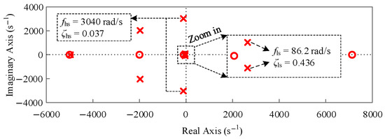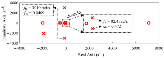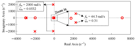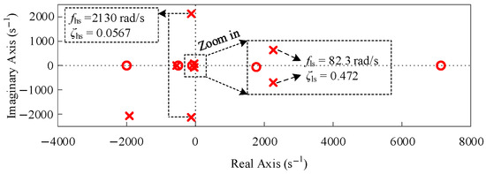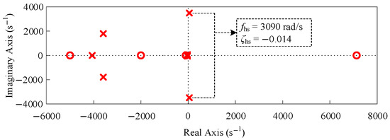 The same conclusion can be drawn from the zero-pole diagram shown in Figure 8. In the figure, × and ○ are represented as the pole and the zero of the transfer function respectively. As shown in Figure 8, a pair of unstable HF conjugate poles appears on the right side of the imaginary axis. Furthermore, the oscillation frequency of this pair of poles is 3030 rad/s. Additionally, the damping factor of this pair of poles is −0.008. It can be seen that the theoretical value of the high-frequency oscillation frequency 3030 rad/s in Figure 8 is almost consistent with the actual value of the high-frequency oscillation frequency 2991 rad/s in Figure 2. The effectiveness of the reduced-order model and its transfer function Gviv_eq_line(s) is further verified.