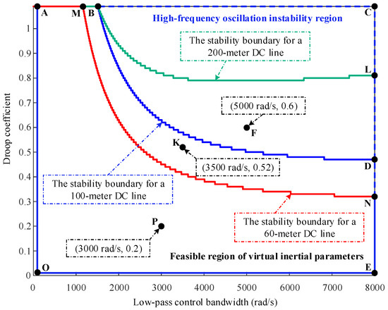 - When the corner frequency falls within the range of [1500 rad/s, 8000 rad/s], the stable boundary between the feasible region of virtual inertia parameters and the high-frequency oscillation instability region is a nonlinear curve. The impact of the interaction between the droop coefficient and the corner frequency on the system’s small-signal stability is nonlinear. In addition, as the length of the DC line decreases, the area of the feasible region for virtual inertia parameters also shrinks.