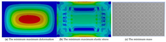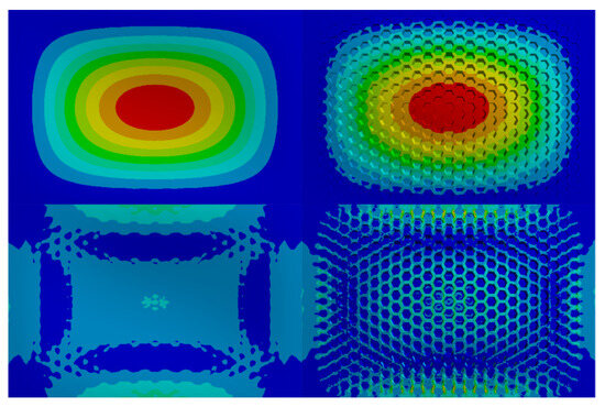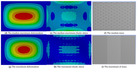 Feature Data Analysis. From Figure 11, the analysis indicates that the deformation at the plate’s center forms an elliptical pattern along the longer edge, suggesting that a more uniform stress distribution can mitigate maximum deformation. The maximum elastic stress is localized at the corners of the longer edge, with a low-stress rectangular annular zone observed. Circular structures exhibit lower utilization and resistance to deformation compared to hexagonal ones, and increasing the coverage rate significantly reduces mass without substantially affecting deformation.