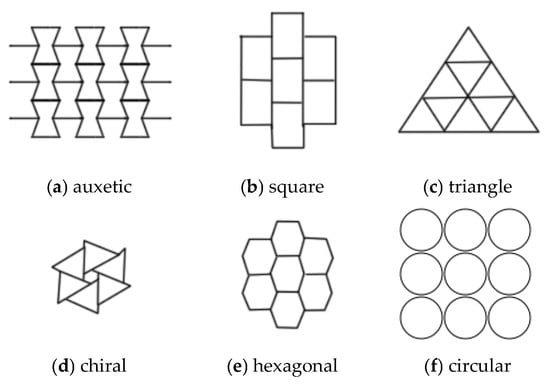 The honeycomb structure is renowned for its ability to minimize substrate mass while maintaining requisite strength, making it a focal point of scientific research due to its exceptional mechanical properties. A variety of honeycomb configurations exist, such as negative Poisson’s ratio honeycombs, hexagonal, circular, square, triangular, and chiral honeycombs, each with unique characteristics, Figure 2. In load-bearing applications, the approach is often targeted towards optimizing cost-effective parameters to achieve the most efficient structural performance with minimal material and cost. Marklolin’s calculations have demonstrated that honeycomb structures are the most material-efficient for a given volume, indicating their optimal topological structure for covering two-dimensional planes. Moreover, honeycomb structures exhibit superior impact resistance compared to single-layer panels, which is a critical consideration in many engineering applications. This enhanced impact resistance is attributed to the structural complexity of honeycombs, which allows for better energy absorption and distribution upon impact. Therefore, the honeycomb structure not only offers a lightweight solution, but also provides significant advantages in terms of mechanical performance and durability [6,7].