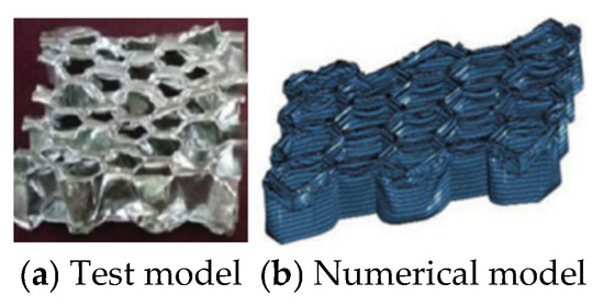 Recent studies have conducted experiments on aluminum honeycombs, as shown in Figure 3, to analyze the force variation during the crushing process under normal pressure. However, these studies have not delved further into the changes in structural properties. Moreover, due to differences in applied forces and model scales, the collapse deformation observed is somewhat different from the deformation caused by normal pressure in honeycomb structures used in industrial production [15].