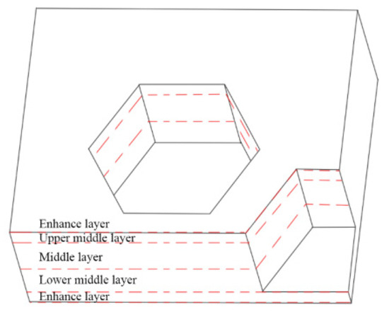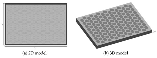 In this study, a substrate model consisting of honeycomb cells is shown in Figure 4. The geometric dimensions of the plate are length L, width B and thickness H. The Global Cartesian Coordinate System Oxyz is established so that the origin is located at the corner of the middle face of the substrate.