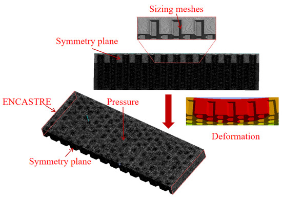 Li’s research employed the homogenization technique to scrutinize the influence of honeycomb thickness on mechanical properties and elastic modulus. Finite element simulation methods were utilized to derive effective stress–strain curves, local stress values, and deformation amounts, providing a comprehensive analysis of the structural integrity [38]. Sorohan replaced the honeycomb structure with a homogeneous orthotropic solid structure, and used the model to obtain mechanical properties [39]; the numerical approximations of the homogenized orthotropic solid structure closely align with the outcomes of the original numerical analyses. Salehi has adeptly employed a three-dimensional elastic graded finite-element method, accounting for the continuity of plate thickness, stretching, and material properties. This approach circumvents the limitations inherent in approximate plate theories and conventional finite element methods, yielding more precise analytical results for the shear buckling of functionally graded-material annular-sector plates [40]. Therefore, this paper adopts the homogenized model to simulate the behavior of the honeycomb structure.