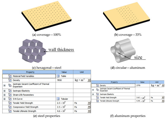 Taking wall thickness (a), size (b), coverage rate (c), material (d), and shape (e) as experimental factors, among them, two levels are designed for material and shape, and three levels are designed for wall thickness, size, and coverage rate. The experiment was conducted with maximum deformation (Y1), elastic stress (Y2) and mass (Y3) as response factors; experimental factors and levels can be seen in Table 1, and the schematic of the experimental factors is shown in Figure 7.