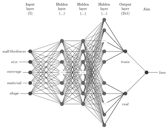 By analyzing the mathematical model of the honeycomb, we selected the influencing factors and determined their value ranges. Furthermore, experiments were conducted to obtain the regression model for the response objectives. On this basis, a dataset is constructed by generating 2000 random and uniformly distributed data vectors through code, with 80% used for training purposes and the remaining 20% for testing, which can also solve the sample imbalance problem. Next, an ANN model with 7 hidden layers was designed to predict the maximum deformation, maximum elastic stress, and mass of the plate under pressure. To evaluate the accuracy and performance of the artificial neural network model, the mean square error (MSE) was used as the evaluation metric. The MSE is defined as follows: