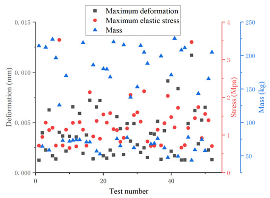 From Figure 14, the influence of material on maximum deformation is significantly more pronounced with steel compared to aluminum alloy, with disparities intensifying as various influencing factors are altered. When steel is utilized, mass is affected more markedly than with aluminum alloy, indicating that higher material density and strength necessitate stricter experimental parameter ranges in the structural-optimization design process.