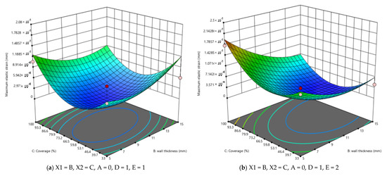 In the response surface graph, the steeper the graph, the greater the influence of the factor on the result. In Figure 12, it is observed that with constant material and shape, deformation increases uniformly as wall thickness decreases and size increases, peaking when both are at their maximum values. The change is stable, without significant fluctuations, and the interaction effect is linear, indicating interaction. With constant wall thickness and material, deformation first decreases then increases with coverage rate, reaching a minimum at 66.7% coverage. As size increases, deformation peaks at 90 mm, with a relatively flat curve compared to coverage rate changes. Interactions increase the deformation’s curve-fitting rate with influencing factors. With aluminum alloy, interactions are more pronounced. With constant size and material, wall thickness and coverage rate significantly interact; deformation decreases with thicker walls and shows a trough at 15 mm wall thickness and 59.8% coverage rate. The maximum deformation regression equation is as follows: