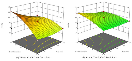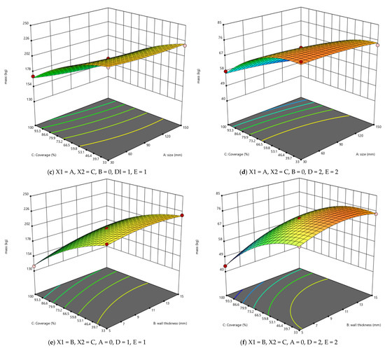 At a constant coverage rate and material, mass diminishes with decreasing wall thickness and increasing size, exhibiting a gentle, linear relationship with a lower slope. With wall thickness and material held constant, mass markedly decreases as coverage rate increases. Variations in size, influenced by changes in coverage rate, result in more substantial mass reduction at higher coverage rates, albeit to a limited extent. When size and material are constant, reducing the coverage rate and increasing wall thickness lead to a mass increase, with interactive effects analogous to those observed when wall thickness and material are held constant. Although the interactive effects among factors are less pronounced in mass compared to deformation and elastic stress, the linear variations of certain influencing factors significantly affect mass. The mass equation is as follows: