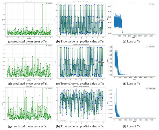 Model Performance Evaluation. In Figure 15, a comparison reveals the alignment between predicted and calculated values, alongside error metrics and the convergence of the MSE loss function. The majority of predictions fall within a narrow margin, with a minority exhibiting larger discrepancies, potentially attributable to the limited depth and iteration count of the network. Nonetheless, even for these outliers, predictions remain within an acceptable range. The congruence between the outcomes of the two distinct methods is evident. The loss functions decrease with each iteration, eventually attaining a stable, convergent value. The MSE values for Y1, Y2, and Y3 are 1.671 × 10−5, 2.629 × 10−5, and 2.063 × 10−6, respectively. Therefore, it can be concluded that the ANN model is suitable for predicting the maximum deformation, maximum elastic stress, and mass properties of the plate under different design parameters.