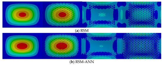 Similarly, Li used nonlinear finite element methods and ANN to study the ultimate strength of multi-cracked ship panels under axial compression [11]; Tahir applied ANN to predict the buckling load of thin cylindrical shells under axial compression [26]; Pham combined the element method with ANN to study the free vibration response of honeycomb core panels [27]; Wang proposed a boundary strategy based on ANN to strike a balance between accuracy and efficiency [28]; and Mahesh employed the finite element method–ANN approach to study the coupled static parameters of composite laminated plates [29]. In practice, these methods are set as representing optimal prior knowledge, yet they are usually difficult to use for training [30], despite these algorithms having been developed and put into use [12,13,14]. To address the aforementioned issues, researchers have established relevant mathematical expressions for the variation of properties in the honeycomb structure. Mcfarland provided an approximate model for determining the average stress of hexagonal structures [31]; Wierzbicki established a theoretical method based on the principle of minimum plasticity and energy considerations, to obtain the crushing strength of honeycomb core [32]; Liaghat used the minimum plasticity principle and energy considerations theory, taking into account typical folding elements with two angular elements [33]; and Yin obtained the honeycomb‘s average pressure by distinguishing the folding mechanism into two different folding patterns [34]. Many researchers have demonstrated the synergistic benefits of integrating finite element methods with other techniques to enhance data analysis capabilities. Building on this, we opt to merge ANN with RSM to further our investigation.