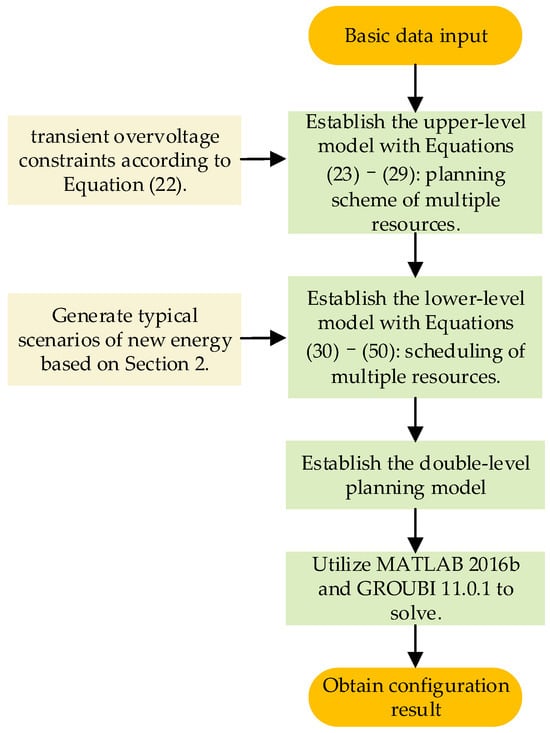 Considering the transient overvoltage constraints, a dual-layer optimization planning method for the wind–solar–thermal-storage bundled HVDC sending system is proposed in Section 5. The optimal configuration of wind–solar–thermal storage is achieved. The framework of the planning strategy is shown in Figure 3. Firstly, considering the transient overvoltage characteristic and the short-circuit capacity, the transient overvoltage constraint corresponding to the voltage support strength is established. Then, the dual-layer planning model of the wind–solar–thermal-storage bundled HVDC sending system is established. The upper-layer model optimizes the configuration scheme of the multiple resources to minimize the total system cost. Considering the typical scenarios of renewable energy and delivery load, the lower-layer model optimizes the operation scheduling of wind–solar–thermal storage to guarantee power balance. Finally, the optimal capacity planning scheme for the wind–solar–thermal storage is determined through the coordinated optimization of the two-layer model.