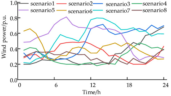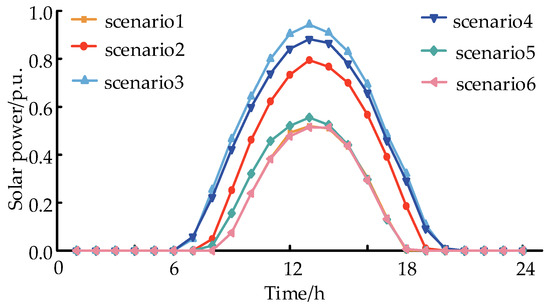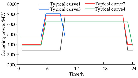 To verify the validity of the proposed model, an 8000 MW DC sending system of the Northwest Grid of China is taken as an example for simulation analysis. The supporting thermal power unit is the 660 MW unit, and the minimum output is taken as 30% of the installed capacity, which is obtained from the actual HVDC transmission engineering of Xinjiang, China. The investment cost of the individual unit is 4.4 × 106 CNY/MW. The investment cost of the wind turbine is taken as 4 × 106 CNY/MW, and the capacity of a single turbine is 2 MW. The investment cost of photovoltaic is taken as 3.5 × 106 CNY/MW. The investment cost of energy storage capacity is taken as 1.5 × 106 CNY/MW, and the investment cost of energy storage power is taken as 6 × 105 CNY/MW. The cost coefficients of multiple generation resources are obtained from reference [33,34]. The minimum penetration rate of renewable energy in the sending system is taken as 30%. The discount rate for the planning year is 8%. The planning period and design life of the thermal power unit are both 25 years, and the design life of the energy storage is taken as 15 years. Typical power demand curves and typical scenarios for wind and photovoltaics are shown in Figure 4, Figure 5 and Figure 6. The final renewable energy power scenarios are obtained by combining wind power and photovoltaic scenarios, with a quantity of 48. The data on renewable energy and delivery load are obtained from the actual HVDC system of Xinjiang, China. The MATLAB 2016b (The MathWorks, Natick, MA, USA) is utilized to process and analyze the results of experimental studies. The proposed models are solved by GUROBI 11.0.1 (Gurobi Optimization, Beaverton, OR, USA).