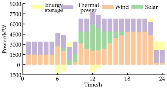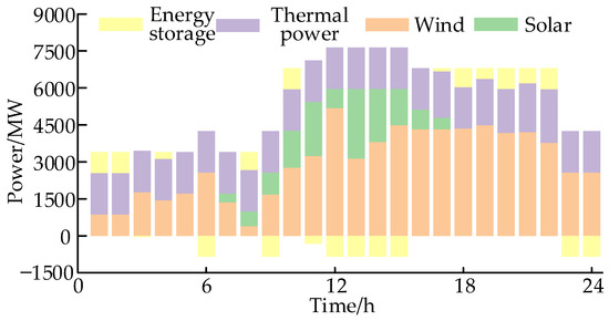 The planning results for wind–photovoltaic–thermal storage under different grid support capacities are shown in Table 3. As shown in Table 3, with the gradual increase in the grid support level, the energy storage capacity of the DC sending system gradually decreases, while the average annual operating cost of the outgoing system also decreases. By increasing the coordination with the sending AC power system, the renewable energy consumption space of the integrated sending system can be enhanced, and the investment and operating cost of the supporting resources can be reduced. Meanwhile, the economy and efficiency of the planning and operation can be improved.