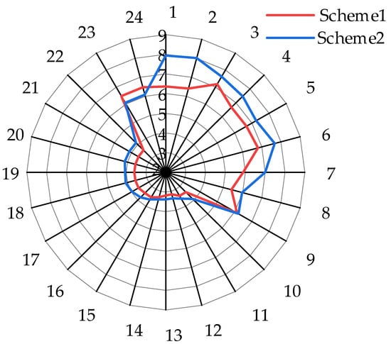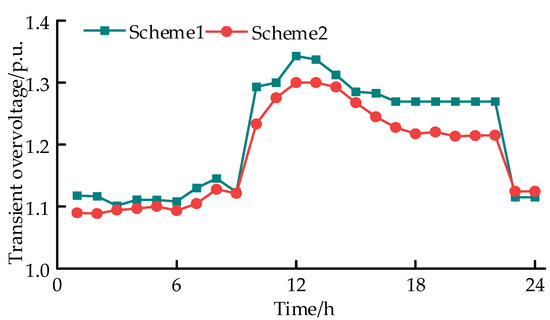From Figure 11, it can be seen that both Scheme 1 and 2 have a high short-circuit ratio in the 1:00–9:00. This is because the sending-out load is at a low level during these periods, and the HVDC converter consumes less reactive power. The short-circuit capacity provided by wind power and thermal power can ensure a high short-circuit ratio for the HVDC transmission system. Therefore, the transient voltage stability is enhanced, and the risk of new energy disconnection is low. However, from 10:00 to 22:00, the system short-circuit ratio decreases, and the transient overvoltage is at a high level. This is because the delivery load of the external transmission system significantly increases, and the reactive power consumption of the converter also rises. On the other hand, compared to Scheme 1, Scheme 2 can maintain a high short-circuit ratio level and keep the transient overvoltage within a safe range while completing the external transmission plan.