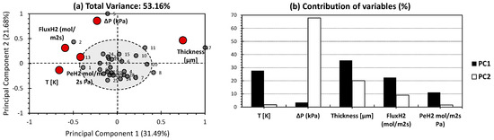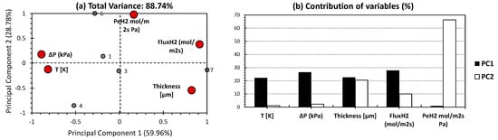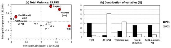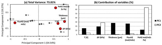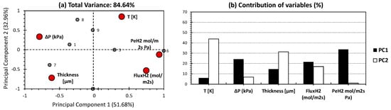 The high variance would indicate the higher rate of presentation for the PCA when subsets are acquired [13,14,15,17,18]. This would increase the reliability of PCA findings. For the variables, all physical and operational features, apart from PeH2, have shown moderate contribution along PC1 (around 20–30%; Figure 3b). For the latter, it encompassed most of the contribution along PC2 (scoring 66.26%; Figure 3b). The rest of the variables exhibited minor to negligible influence for this PC. This would indicate that permeability towards H2 for the investigated membranes (1, 3, 4, 6, and 7) is more likely independent of the other four variables at hand. Figure 4 shows the PCA investigation for membrane samples that showed a positive correlation along PC1 and a negative one along PC2, when the entire dataset was considered (Figure 1). The PCA biplot showed a total variance of 84.64% (51.68% and 32.96% along PC1 and PC2, respectively; Figure 4a). For the variables, the highest contribution was yielded for PeH2, accounting for 33.70% of PC1 (Figure 4b). Except for temperature, the rest of the variables showed minor to moderate contribution (from 14% to 24%; Figure 4b). For PC2, the highest contribution was scored for temperature, accounting for 43.84% (Figure 4b). For FluxH2 and thickness, minor and moderate contributions occurred (17.06% and 31.32%, respectively; Figure 4b). Figure 5 shows the PCA investigation for membrane samples that showed a negative correlation along PC1 and a positive one along PC2 when the entire dataset was considered. The PCA biplot showed a total variance of 85.79% (54.60% and 31.19% along PC1 and PC2, respectively; Figure 5a). For the variables, moderate contributions were yielded for PeH2, FluxH2, and temperature (from 25% to 30%; Figure 5b). For PC2, the highest contribution was yielded for ΔP and thickness, accounting for 51.66% and 33.53%, respectively (Figure 5b). This shows a good independency between the variables mostly yielded along both PCs. An even higher discrepancy between variables was noticed for the negatively yielded samples on the first two PCs, when the entire dataset was taken into consideration. These trends are shown in the PCA biplot of Figure 6. In fact, all variables have shown low to moderate contribution along PC1 (Figure 6b), while PC2 was mostly dominated by PeH2 (64.39%; Figure 6b). In brief, the discrepancies between trends in PCA subsets are primarily influenced by the type of samples included in the analysis. Each subset showed reliance on several sets of variables. In addition, the increase in total variance confirms the necessity of data splitting to achieve a better comparison between the different samples.