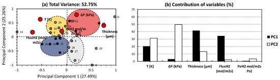 Figure 2 shows the PCA presentation with the exclusion of outliers (membranes 2, 5, and 17). The first two PCs accounted for a presentation nearly similar to the entire dataset approach (52.75% of total variance, 27.49% for PC1, and 25.26% for PC2; Figure 2b). This high similarity would indicate that scenario (a) is more likely plausible than scenario (c) (See Section 3.1.). It is worth mentioning that discarding the outliers allowed for the better separation of different samples and led to the formation of four different clusters (Figure 2). For the variables, a noticeable separation can be identified among the variables, except for temperature. In other words, the variable that exhibited moderate/high contribution around PC1 did not manifest any distinct contribution along PC2 and vice versa. The highest contributions were scored for thickness and FluxH2 (41.51% and 34.30%, respectively; Figure 2b), along with PC1. A moderate contribution were scored for Temperature (20.48%; Figure 2b). For ΔP and PeH2, they showed minor contributions along PC1. For PC2, most of the contribution was distributed between T and ΔP, scoring 31.33% and 49.66%, respectively (Figure 2b). The rest of the variables exhibited low to minor contributions for PC2. These trends highlight the high dependency between the adopted temperature and thickness, permeability, and hydrogen flux, which should be considered when employing Pd-based composite membranes. This relationship was obscured in the full dataset approach.