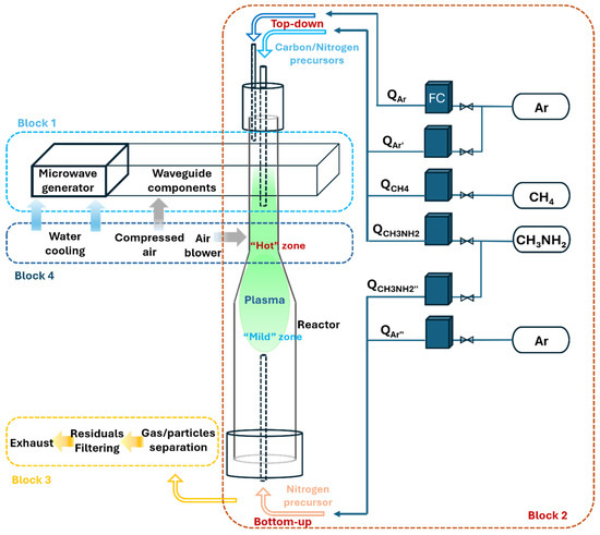 The second block includes the reactor tube, and the injection lines for the background gases and the precursors (comprising flow controllers (FCs), valves, gas cylinders, and the respective pressure reducers). The background gas was injected into the reactor from the top and close to the reactor’s inner wall; the precursors were injected through smaller diameter quartz tubes, concentric with the reactor, one from the top (top-down injection) that passed through the region inside of the wave-launcher and terminated further down at the plasma’s active zone; another from the bottom (bottom-up injection) that terminated at a mild plasma zone (Figure 1). This design permits control over the thermodynamic conditions (gas velocity, thermal fluxes, residence time, etc.) in the plasma reactor.