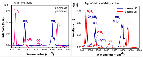 Infrared absorption spectra of the (a) Ar/methane and (b) Ar/methane/methylamine outlet gas with the plasma on and off.