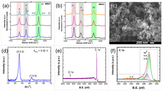 The samples synthesized under laminar flow conditions (#MG) revealed the dominant presence of small graphene-like sheets (~300 nm size), as seen on the SEM micrograph (Figure 3c). Moreover, the characteristic for the free-standing graphene morphology, comprising curved fine sheets, was revealed. The corresponding Raman spectra from three randomly chosen locations on the sample (#MG1), presented in Figure 3a, show three dominant Raman modes at ~ 1331, 1581, and 2657 cm−1, attributed to the D-, G-, and 2D-bands, respectively. Additionally, low-intensity D’ (~1617 cm−1), D+D’’ (~2459 cm−1), D+D’ (~2920 cm−1), and 2D’ (~3238 cm−1), typically observed in graphene-based structures, were also detected. The G-band is the intrinsic feature of all sp2 carbon bonds. The D- and D’-bands are typically ascribed to defects, and their intensity depends on the concentration of the defects in the layer, as well as on the size of graphene flakes. The 2D-band, activated by a second-order scattering process, is the characteristic feature of the graphene. The high-intensity sharp 2D peaks in the Raman spectra (Figure 3a) provide evidence of the existence of single- and few-layer graphene sheets [33]. Moreover, the three spectra are nearly identical, indicating that the synthesized sample is homogeneous.