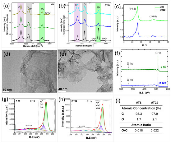 (a,b) Raman spectra, (c) XRD patterns, (d,e) TEM micrographs of #T8 and #T22, (f) XPS survey spectra, (g,h) XPS C 1s regions, (i) XPS quantification/atomic concentrations (%), and relevant atomic ratios. Synthesis conditions: #T8 and #T22.