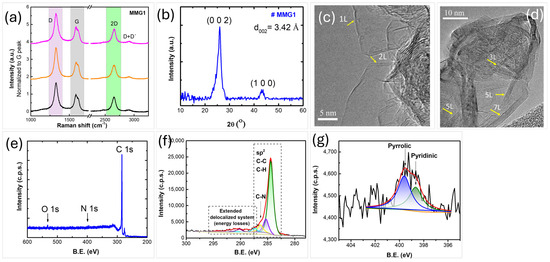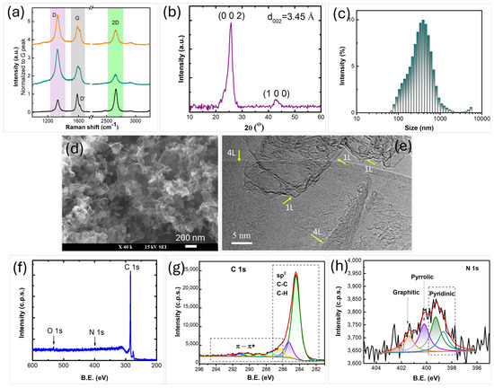 The XRD pattern shows a well-defined (002) plane at 2θ~26.04°, corresponding to an estimated interlayer distance of ~3.42 Å (Figure 5b). The chemical composition of the as-synthesized structures, identified by the XPS analysis, reveals a doping level of ~0.71 at.% of nitrogen, with an oxidation level of ~2 at. % (C/O = 46.7) (Figure 5e–g). The relatively high content of sp2 carbon atoms = 67% (sp2 % = Csp2/CTotal area × 100) attests that the planar structures are preserved during the synthesis process with the injection of the N-precursor in the plasma reactor. Pyridinic, at 398.6 ± 0.2 eV (41.4%), and pyrrolic (and/or nitrile), at 399.6 ± 0.2 eV (58.6%), nitrogen are the dominant configurations (Figure 5g) [39,40].