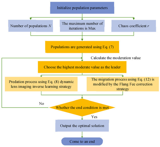 In summary, the flowchart of the multi-strategy improved Black-winged Kite Algorithm (IBKA) is shown in Figure 2. Step 1: Initialize the population parameters, including the population size N, the maximum number of iterations Max, and the chaotic coefficient r. Generate the initial population using Equation (7), calculate the fitness values of the initial population, and select the individual with the best fitness value as the leader. Step 2: Update the positions of individuals by incorporating the predation process with the reverse learning strategy based on dynamic lens imaging using Equation (8) and the migration process with the Fraunhofer diffraction correction strategy using Equation (12). Step 3: Recalculate the fitness values of the population and reselect the optimal individual as the leader. Step 4: Check if the termination condition is met. If so, end the algorithm; otherwise, repeat Step 2.