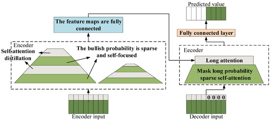 The Informer model introduces three improvements to the Transformer architecture, aiming to enhance computational efficiency and predictive capabilities within the self-attention mechanism [57]. It innovatively incorporates a sparse self-attention mechanism, which reduces the computational complexity of self-attention from quadratic to a more efficient level by streamlining the convolutional pooling operations in the attention layers. Furthermore, the model employs self-attention distillation techniques, effectively reducing the dimensionality and the number of network parameters. This not only strengthens the model’s ability to handle long-term dependencies but also significantly boosts its overall performance. Additionally, the Informer is equipped with an advanced generative decoder that computes all prediction values simultaneously. This feature not only accelerates the prediction process but also ensures a substantial improvement in prediction accuracy, enabling the model to more precisely capture the complex dependencies between inputs and outputs [58,59,60]. The structure of the Informer model is illustrated in Figure 3.
