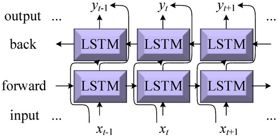 The Bidirectional Long Short-Term Memory (BiLSTM) network model is an improvement upon the traditional Long Short-Term Memory (LSTM) network. BiLSTM integrates two LSTM models, one processing the sequence data in the normal time order and the other processing the same sequence data in the reverse time order [61,62]. Through this bidirectional processing, BiLSTM can simultaneously capture both past and future information in the sequence data, making it more comprehensive than using LSTM alone. The structure of BiLSTM is shown in Figure 4.