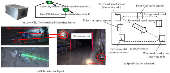 Currently, methane sensors have a detection accuracy of 0.01%, which limits accurate measurements of methane concentrations in the return airflow [63,64]. Therefore, this study employs a laser methane concentration monitoring sensor, as shown in Figure 6a. It can measure the average concentration along a linear path of methane across the entire section. The specific layout scheme is shown in Figure 6b. The linear arrangement of sensors enables continuous measurements along the path, making it suitable for large-scale applications in complex environments and outperforming point sensors. The monitoring process is depicted in Figure 6c. Monitoring points are set up at the 1400 m mark of the return airway in the third panel of the 12th coal seam, the 1500 m mark of the main return airway of the 12th coal seam, and the 460 m mark of the return airway in the second panel of the 42nd coal seam in the Buertai Coal Mine. The monitoring activity will be conducted from 1 April 2024, to 31 July 2024, with data recorded every 60 s.