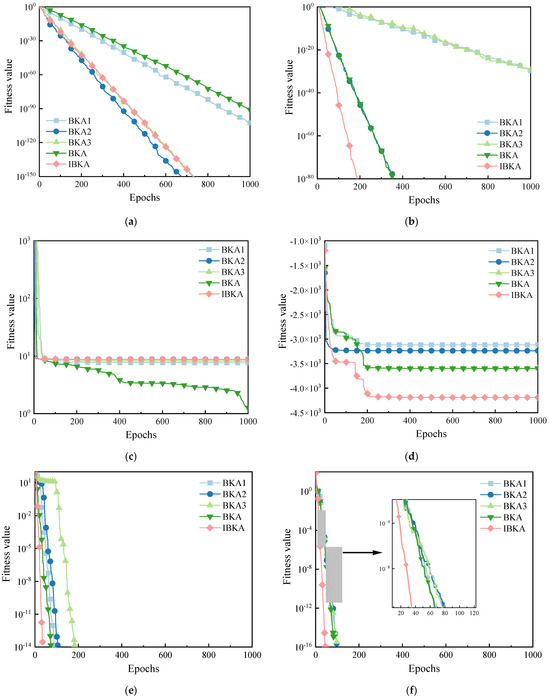 To further analyze the performance of the algorithms, the average convergence curves of the improved algorithms for some test functions are plotted, as shown in Figure 7. Within the limited number of iterations in Figure 7a,b, the corresponding curves of BKA1, BKA2, BKA3, BKA, and IBKA converge in sequence. In Figure 7a, the improved algorithms all outperform the BKA with significantly faster convergence speeds, among which BKA2 is the best, and IBKA and BKA3 are close behind as the second-best algorithms. In Figure 7b, the IBKA demonstrates significantly better convergence speed and accuracy than the other algorithms. In Figure 7c, the algorithms do not converge, and the convergence curves of each algorithm follow a similar trend. In the early stages, when all algorithms are trapped in local optima, BKA2 has the steepest convergence curve, followed by the IBKA. Eventually, all algorithms become trapped in the local optima, but the BKA shows a tendency to escape from the local optima. In Figure 7d, the IBKA shows a tendency to escape from local optima when one-fifth of the iteration process is completed. During the first one-fifth of the iteration process, the IBKA consistently converges with a steep slope and is the closest to the optimal solution among all algorithms. In Figure 7e,f, all algorithms converge. In Figure 7e, BKA1, BKA2, BKA, and IBKA follow similar trends and converge with steep slopes in the early stages. Among them, the IBKA has the steepest slope. When one-tenth of the iteration process is completed, BKA3 shows a tendency to fall into a local optimum, but it quickly escapes after a short period of iteration. In Figure 7f, all algorithms converge with steep slopes and follow similar trends, with the IBKA consistently leading the other algorithms in convergence slope. It can be seen that the incorporation of the Tent chaotic map, the dynamic lens imaging reverse learning strategy, and the Fraunhofer diffraction correction strategy increases the population diversity of individuals and effectively improves performance. These improvements help overcome the algorithm’s deficiencies when dealing with single-peak and multi-peak functions.
