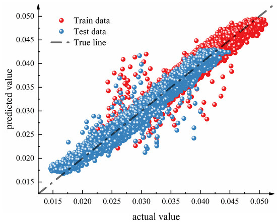 The generalization capability of the model developed in this study was validated using two datasets collected by laser methane concentration monitoring sensors located 1500 m into the main return airway of the No. 12 coal seam and 460 m into the return airway of the second panel in the No. 42 coal seam at Buertai Mine. The model parameters and optimization methods were consistent with those described previously. The fitting results for the training and test sets are shown in Figure 9.