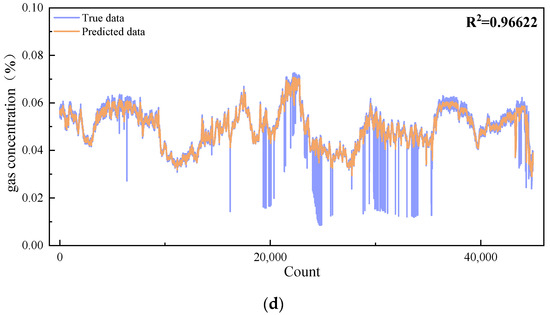Fitting results for datasets from other roadways. (a) Fitting effect of the training set for methane concentration at 1500 m into the main return airway of the No. 12 coal seam. (b) Fitting Effect of the test set for methane concentration at 1500 m into the main return airway of the No. 12 coal seam. (c) fitting effect of the training set for methane concentration at 460 m into the return airway of the second panel in the No. 42 coal seam. (d) Fitting results of the test set for methane concentration at 460 m into the return airway of the second panel in the No. 42 coal seam.