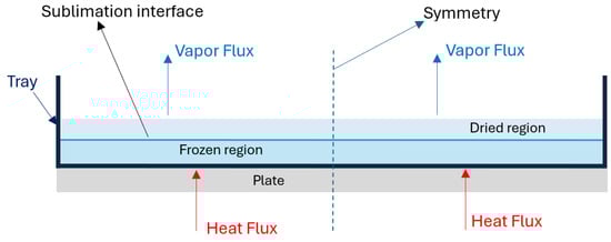The vacuum sublimation drying process has gained increasing attention due to its ability to preserve the sensory and nutritional properties of mare’s milk, but it remains energy-intensive and costly [4,5]. Several mathematical models have been developed to describe freeze-drying processes [7,8,9,10]. Among these, the one-dimensional sorption-sublimation model by Liapis and Litchfield [10] is the most widely adopted, accounting for the simultaneous sorption and sublimation of moisture. However, the model is one-dimensional, with the sublimation interface shifting as drying progresses. Liapis and Litchfield employed a one-dimensional moving interface [11], which requires a one-dimensional material with no bends. While effective, this model oversimplifies spatial variability in temperature and moisture distribution. Subsequent advancements, such as the two-dimensional models by Tang et al. [12] and Mascarenhas et al. [13], and three-dimensional models by Scutella et al. [14], offer greater accuracy but remain computationally intensive and lack validation for food products like mare’s milk. Similarly, Srinivasan et al. [15] focus on the numerical investigation of heat and mass transfer in the freeze-drying of milk within a vial. Their study extends to the analysis of phase changes and mass transfer dynamics that influence the freeze-drying process. The results highlight the crucial role of heat flux and moisture removal in determining freeze-drying performance, thus offering valuable practical recommendations for optimizing such processes in the dairy industry.